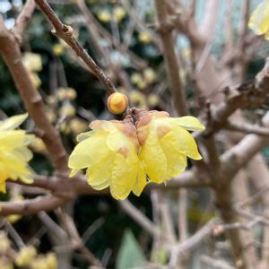 ロウバイ(蝋梅) 蝋のような艶やかな花弁と清々しい香り ムクドリが蕾を食べちゃうのでネットをかけて守り、ようやく咲かせました。