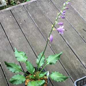 ホスタ「サガエ」が咲き始めました。この春ネット(四国ガーデン)で買った「ホスタ5種みはからい」のうちの一つ。葉の大きさや花を見て、秋に地植えする予定です。
