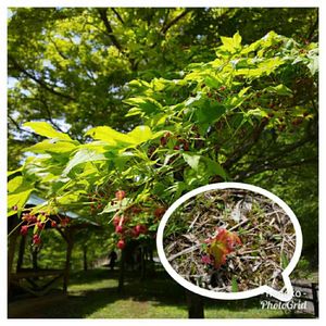 GW唯一のお出かけ2 「モミジの親子」 道志みちから松茸山自然の森公園に寄り道 東屋とテーブル、炭焼き小屋、トイレがあるだけのスペースでしたが、回りはモミジが沢山❗️ ちょうどお花も咲いて、春のモミジも素敵でした。そして、足下にはモミジベビーが‼️ 秋の紅葉🍁も楽しみですが、ベビーの成長を見るのも楽しみですね~🎶 秋にまた来てみたい場所です🎵