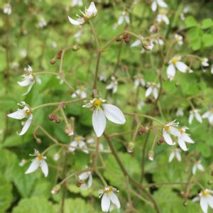 追追記:葉脈が白く、ランナーを出すのはハルユキノシタではなく、ユキノシタだそうです→ ユキノシタが咲いています。昔母が植えたものが増えました。丈が低いし常緑だし花も可愛いしどんどん増えるし抜くのも簡単だし(確か天ぷらとかで食べられるし)、で日陰の下草・グランドカバーとしてとても気に入っています。 追記:正確には「ハルユキノシタ」だそうです。「ユキノシタ」は葉の裏が赤く、上部の花弁がピンクとのこと。