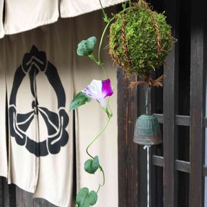 軒先の苔玉から朝顔が💕 涼しい風がチリン🍃