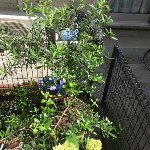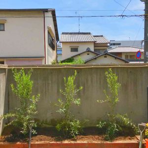 全く成長しなくなったオリーブの木を地植えにしました。 バックが柵のフェンスだとちっとも映えませんね😓 板を貼ると防犯上ちょっと心配だし、 何か良い案頂きたいです🙏