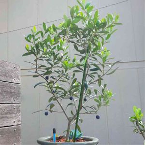 ネバディロブランコ オリーブツリーです。小さく育てています。 収穫せずにおいた実が熟しています😊