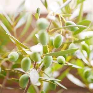 結実した挿し木オリーブ苗木です。 品種不明ですが、実にはオリーブの特徴が出るので、無事に大きくなれば品種をほぼ確定できるのでは?と期待しています😊 候補はコロネイキかな?