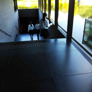滋賀県の佐川美術館へ 行ってきました。 女子高の団体さんと遭遇。 あまりの美しさに、思わず 写してしまいました。 楽焼きの常設展へと続く通路にて。