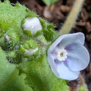 ヤマルリソウ たくさん咲いていた斜面はイノシシが踏み潰して全滅😭だったが、別の林の これまた崩れそうな傾斜地で出会う(⌒‐⌒) キュウリグサの副花冠と同じように5つに分かれているけれど、各々2つに分かれるので10個に見える❇️毛むくじゃらの蕾の中や咲き始めはピンクで開けば青の 金曜日の蕾たち🏷️