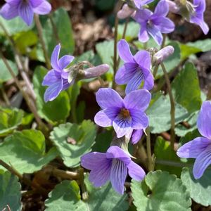 タチツボスミレ② 落ち葉の中、薄紫の絨毯のように広がって咲くスミレの様子を見てみました。 茎が伸びて、そこから花柄や葉が分岐し、花が咲いている個体もあります。茎と葉の裏は緑、距の色は花と同じ、葉や花の形からタチツボスミレかなぁ、と思っていますが・・🤔