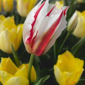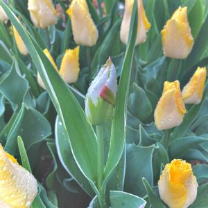 オハヨウ ゴザイマスル 薄く雲がある 晴れ うちのチューリップ30個出て5個が黄色系 6個がこの子です