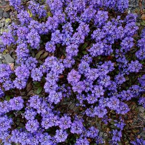 駐車場の砂利場に植わるアシュガが咲き出しました♪ 私が外出中にこの場所をよその車が方向転換に 使ってしまうのが嫌でわざとに植えております😅
