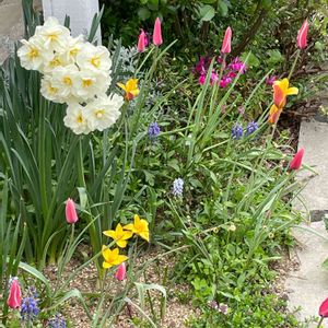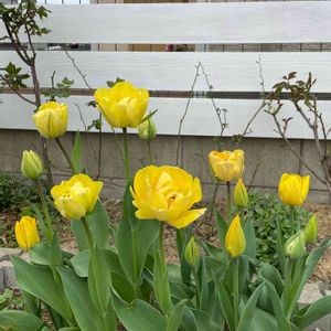 黄色の八重のチューリップが可愛いです😍 お隣にフェンスを超えてバラの枝が出ちゃうのが気になっていたのですが(気をつけて切りまくっていました) 息子が白い板壁を作ってくれました。 ありがたいです😊 お花も引き立ちますよね!
