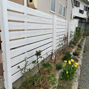昨日の白い板壁です♪ バラを植えてある所に建ててくれました。 間が空いている所は低く板をつけて貰う予定です。 花が咲くのが楽しみになりました😊
