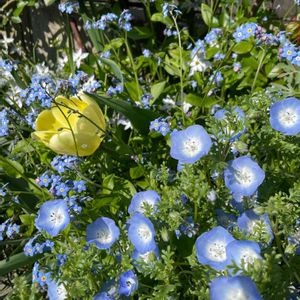 暴れてるネモフィラさんとわすれなぐさ 去年掘り起こしそびれて出て来たチューリップ🌷