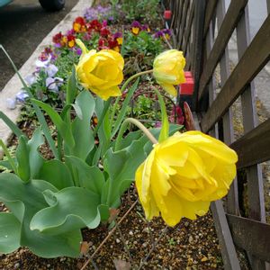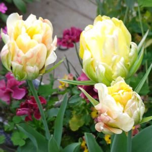 チューリップ達と🌷薔薇の蕾と🌹種からのパンジーちゃん🥰 なんとも散漫なpicですね😝 ピエールさんの蕾がたくさんで🌹嬉しくなって「みどりのまとめ」更新しちゃいました☝️✨🤗