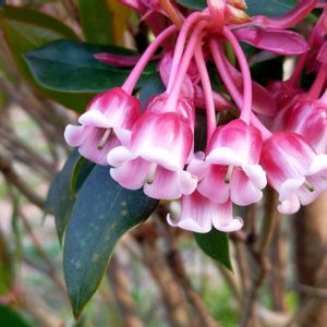 【ホンコンドウダン(ピンクシャンデリア、コヤスドウダン】 中国原産、ツツジ科常緑低木 春に、葉腋から赤い花柄を伸ばし、鮮紅色の釣り鐘状で先端が5浅裂した花を5~10個輪生状に吊り下げる。 日本原産のドウダンツツジと同じ仲間で、ドウダンツツジより大振りで、ロウ細工のようなピンクの花を咲かせる。 樹高:1~3m 開花期:2月~4月 花色:ピンク ときわミュージアム@宇部市