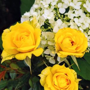 ミニバラとアナベル おはようございます 梅雨入り宣言はされていませんが、どんよりしたお天気で、むし暑く感じます。 わが家の庭は植物が混みあってきて、背丈が低い秋明菊と孔雀草にうどんこ病が発生していました。 ダメダメ〰️!😂横の薔薇にも被害が及ばないかヒヤヒヤします。 そんな中、ミニバラとアナベルが仲良く顔寄せあっています。癒されました~🥰