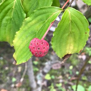 ❥♡ヤマボウシの実♡❥ 🧚♀️食べられる実で、皮は固いですが、中の果肉は甘いです✨ 乾燥したり、ジャムにしたり、果実酒を作ることもできるみたいです。結構万能な実の様です😊 見た目ちょっとグロテスクです❤️