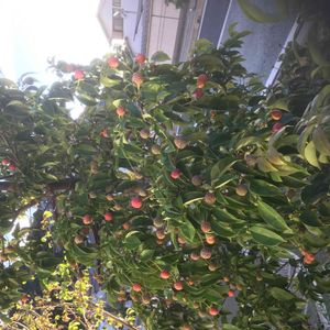 空を見上げると 真っ赤に実った可愛い実が 鈴なりに。 なんて言うのかな 固そうなだけど 美味しそう😋