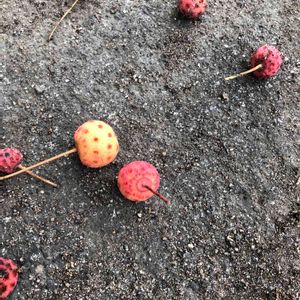 赤く可愛い木ノ実を見ました。見た目さくらんぼみたい、でもわくみるとドットの様な模様何の実なのか知りたいです。
