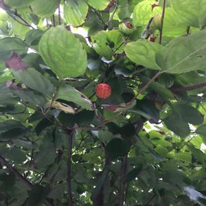 ヤマボウシの実が色づきはじめました♫ 木の下に数個落ちていて、 気がつきました! まだまだ青い実もありました。 基本、上の方になっているので、 写真を撮るのが難しいです〜😅 今年も味見する勇気が‥💦
