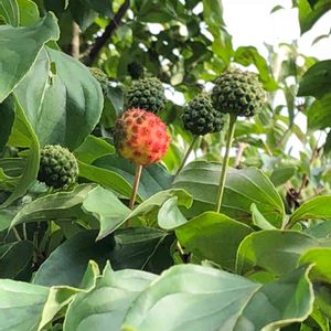 午後☔️止んだので散歩に、ヤマボウシの実が赤く熟したら食べられるとか、今年食べてみようかなぁ、