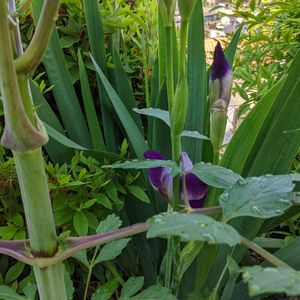 手前が。皇帝ダリアの足👣元。蕾を付けているのが、ジャーマンアイリス。もっと下には、ドイツスズランがいますが、見えていません。😅🙄☀️🐣🐤🐥