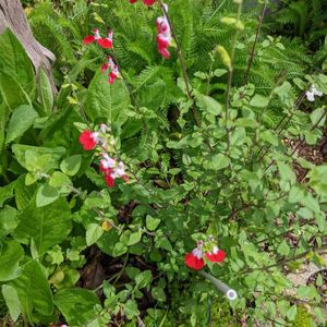 チェーリセージ、東側入口。木戸先にあがり口にて、開花していました。赤、白の花。🌼🏵️☀️