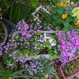 ピンク色のサクラソウの中に。玄関から引っ越しをしてきた、プリムラ・マラコイデスの白色、近くに、キンレンカも、見守ってくれてます。
