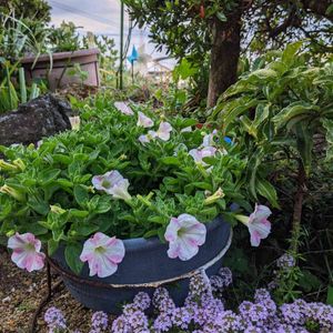 サファニアももいろハート。鉢に沿って、綺麗に花が咲いているのが、良いところ😱🤔🧐💘