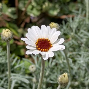 今日のお庭風景です。 ローダンセマム アフリカンアイズ開花です。 シルバーリーフもお気に入りでしたが すっくと花首を伸ばして咲いてる姿が可愛いです。 その株元で這性の本領を発揮しつつある 斑入りのグレコマにも花が咲きだしました。 昨年「カワイイ〜」と植えてみたのはいいけど 凄まじい繁殖力に正直引いていました。 生命力が強いので遠慮なく抜いて調整しています。 斑入りといえばお気に入りのブルンネラ。 心の底からお迎えして良かったと思える品種。 日陰庭には是非おすすめの子です。 この葉も愛くるしい花もどストライクで 今期は少し葉が多く出ているのがまた嬉しい。 ヒューケラも新葉の展開が旺盛で カナヘビちゃんのひなたぼっこスポットみたいです。 ちょっと突いた位じゃ動じません。 カナヘビLOVEの孫娘6歳に写真送ったら 「つかまえといて。こんどもらうから。」だって。 うーん、どうしよう(笑)