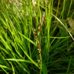 アオスゲ(青菅) カヤツリグサ科スゲ属 濃い緑色の小型のスゲです💚 小穂が固まって付きます💚 草地に普通に見られるそうで、大きな草に隠れてあちこちで見つけました😃🎶 葉は花茎と同長、幅2〜3mm 叢生し匍匐枝を出さない💚 基部の鞘は褐色 小穂は3〜4個で固まって付く💚 頂小穂(1〜2cm)は雄性で側小穂は雌性 雌小穂が根際に付く事は無い 雌鱗片に長い芒があり果胞より長い💚 柱頭は3岐 苞は花序と同長か、やや長い💚 果胞にはまばらな毛がある💚
