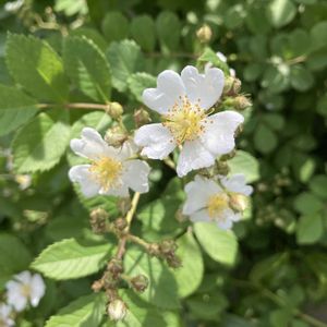 ゴールデンウィークは初夏の花が咲いて来て気持ち良い散歩ができました ①ノイバラ ②イワニガナ(ジシバリ) ③トウバナ ④オヤブジラミ ⑤ケキツネノボタン