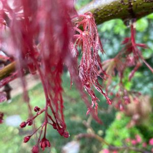 雨の日でした!^_^ ・ヤマモミジの園芸品種、あるいは春に出る葉が紅色で、枝が垂れるモミジの総称。「手向山」をはじめ数多くの品種がある。 ・葉は長さ5センチ、幅3センチほどで7~9つに裂け、縁にギザギザが目立つ。夏は緑色に、秋には黄色あるいは褐色に変化して落葉する。 ・他のモミジと同様、新葉の展開と共に花が咲くが、花は葉と同じような色合いであり、分かりにくい。 (参考文献https://www.uekipedia.jp)