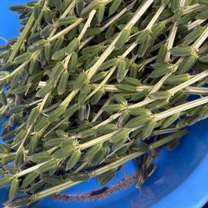 台風🌀で雨が降るかんじだったので 雨になる前にごまをすべて✂️ 鞘がはじけてるのもあってごまが 少したらいにたまってた そこまでたくさん雨が降らないまま 台風🌀は過ぎて行きました〜