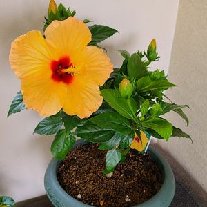 おはようございます。 ハイビスカス、アテネ。 お迎えしました。 カインズホーム東大阪で、出会いました。 黄色オレンジの花が咲きました。 蕾が、全部咲いてくれたら、嬉しいです。 5号から。8号に、鉢まし植え替えしました。 部屋の中で冬越したハイビスカスも、花が咲きそうです。