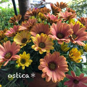 オステオスペルマムのオスティカさん🧡💛 花数増えてモリモリ咲きデス٩(๑❛ᴗ❛๑)۶ 花色の変化に癒されて〜 今年は花後に挿し木しようかなぁ🌱
