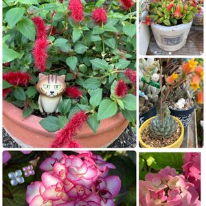 ↖️パープルヘイズかな?満開✨ ↙️その前方に咲く白い花。誰だ? ウチのコに白色いたかな? ↗️レディシア(命名.tetecoサンありがと✨)も咲く気満々✨ →暮らし浜田のちっちゃい花!! ↘️今年も沢山、赤いタコさん咲いてるの。これは誰だっけ?笑