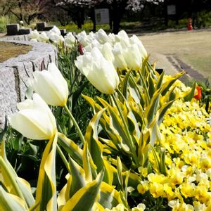 富山県中央植物園より(4月15日) 年間パスが切れるので仕事帰りにぶらりと散策してきました、継続しようか、思案中です😅 ①チューリップ 「ピューリッシマブロンド」 葉の外縁が美しい黄色で、明るく映えて魅力的💛💚強風に煽られ斜めってます😂 ②ヨウラクユリ 「瓔珞百合」と書くそう、なるほど仏具の「瓔珞」に似ているような🤔下向きに咲くお姿が美しい🔔 ③アカボシシャクナゲ 2メートルくらいある木に大きなお花が満開です、その華やかさに毎年、見る度、ドキッとします ④ズミ 「染み」からでた名前といわれ、樹皮は黄色の染料として使われてるそう ハナカイドウに似た、ピンクの蕾がかわいい💓 ⑤お花は、真っ白です😃 別名コリンゴと言われるだけあり、リンゴのお花に似てます、