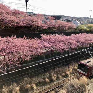 三浦海岸河津桜🌸 今年も行って来ました❗️ ここに来ると思い出すほっこり話😊 「この写真どうですかね?」 「う〜ん!500点‼︎」 て言ってた、撮り鉄の2人組❣️ 今年も来たのかな? 言われたい😆😆500点❗️