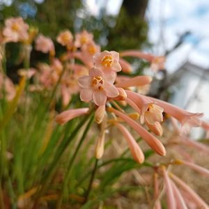 キルタンサス(ヒガンバナ科キルタンサス属) 郵便局に当選したお年玉年賀ハガキを持って交換する頃、迎えの公園の花壇にこのキルタンサスのお花が咲きます。 今年は昨年よりたくさん咲いて、とっても綺麗でした。 ちなみに今年は切手シートが2枚当たりました。 細長い筒状で先端が少しカールした花形がユニークで、その花形からフエフキスイセン(笛吹きスイセン)という和名もつけられています。 暖かい地域では地植えのままにしておけるので、ほとんど手間がかかりません。広めの場所であれば、放っておいても年々株を増やして豪華に咲く姿を楽しむことができるそうです。 🏷 木曜日は桃色
