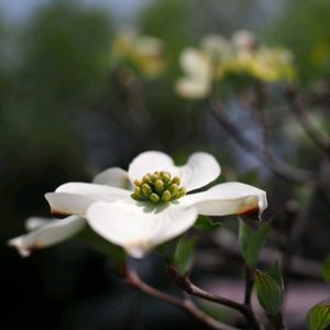 今日のお花 🍀ハナミズキ ミズキ科 ミズキ属 大空に向かって 花ひとつ開いて! 蕊も眩しそうに お目覚めです!