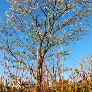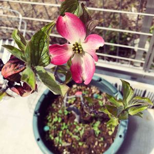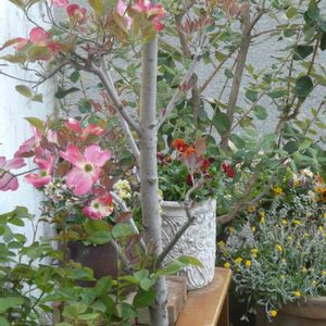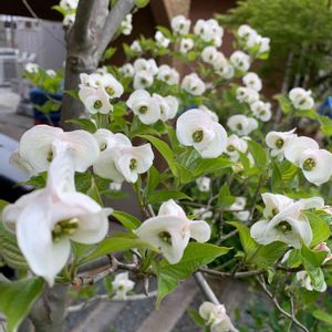 我が家のハナミズキ 花数は少ないけれど綺麗に咲きました 足元に置いてある鉢には バラ クロードモネさんがいます 仕事ものんびりペースなので お庭改造がんばってやっていこ〜