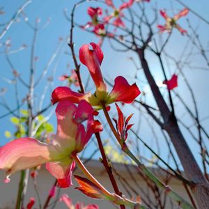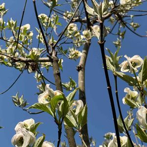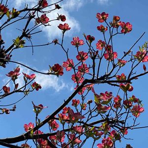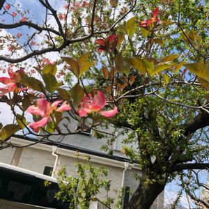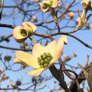 庭のハナミズキが咲き出しました🎵 庭に植えてから何年経つかしら。すっかり大きくなり、もう下から見上げることしかできません。 少し雲が出てきましたが、青空をバックにパチリ✨ 逆光気味だけど、空に向かって気持ち良さそう🎶 白やピンクの花色がありますが、花に見えているのは花の付け根の葉なんだそうですね。