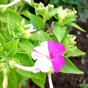 まだ頑張って咲いているオシロイバナ赤白混色♥️🤍 花が咲かなくなった株から片付けています。 赤白混色はこの1株だけです🥀 花数も数個です😅
