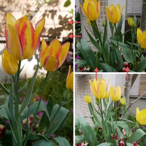 枝咲きチューリップ アントワネット🟡⚪🔴 咲き始めは黄色と白、赤が少しずつ濃くなり、今は3枚めの色に変わりました🌷 花束植え💐