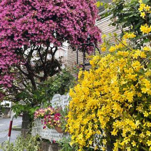💠ベニバナトキワマンサクと キャロライナジャスミン💠 例年ならこれに利休梅とのコラボが見られたのですが、今年は常盤万作の花が遅れました😅 まあるく刈り込んだピンクの花が綺麗です💖 マイガーデン 🏷19日はピンクの日! 🏷ピンクワールドへようこそ 🏷幸せの黄色いお花 🏷あっ火曜日 🏷花曜日 🏷ちっちゃいものクラブ 🏷春の木の花 に参加させていただきます💕