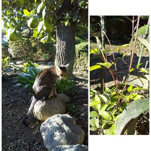 柏の木の下のテッセン。 一度根元まで切り戻したのに 新しい芽を出し40㌢位になっています。 もう一花さかせてくれるのでしょうか。 なんて見ていたら くぅちゃんがやって来てハイ、ポーズ📸 どっちが主役かわからない🤭