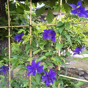 柏の下のクレマチス。 雨に濡れると花びらが金属のような風合いになる。写真で表せないのが残念。 今年は花数が少ないからか、花弁が超特大🙀です。