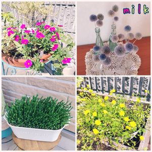💙 ルリタマアザミ 💙 ドライフラワー思ったより色 抜けちやった👀 🩷 PW スーパーベル ポケット ピンク 🩷 暑いけど頑張ってる( *ˊᵕˋ)ノエライエライ🎶 💛 PW メカルドニア ゴールドダスト 💛 この子も暑さに耐えてる𐔌ᵔ꜆ ܸ•⩊•ᵔ 𐦯꜆エライゾ! 💚 若緑 💚 春に挿したの、ワサワサ成長🐣🐥🐤