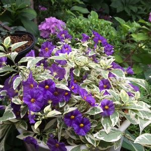 ソラナム・ラントネッティ バリエガータ アメジストを彷彿とさせるとびきりの紫青の花弁と トパーズを思わせるイエローの葯… と説明書きが なんてオシャレなんでしょう 斑入りの葉も爽やか!