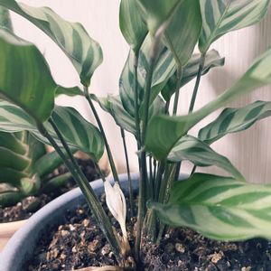 おはようございます☀ よく見かける観葉植物🪴 名前も知りませんが 100均で衝動買い、300円ですが。 今朝見たら白い可愛いお花がさいていました。🤍 嬉しいびっくりです‼️ カラテアフレディと教えていただきました。 ありがとうございます。 よく見ると、まだまだお花咲きそうです。